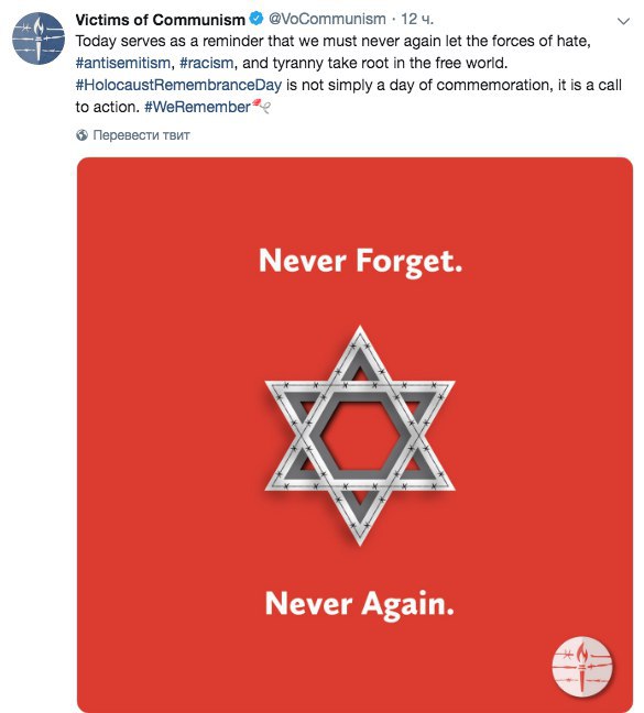 Особенно любопытно видеть, как американская организация "Жертвы коммунизма" вот так солидаризируется на своих страницах в соцсетях с Днём памяти жертв Холокоста. И типа всё ок!