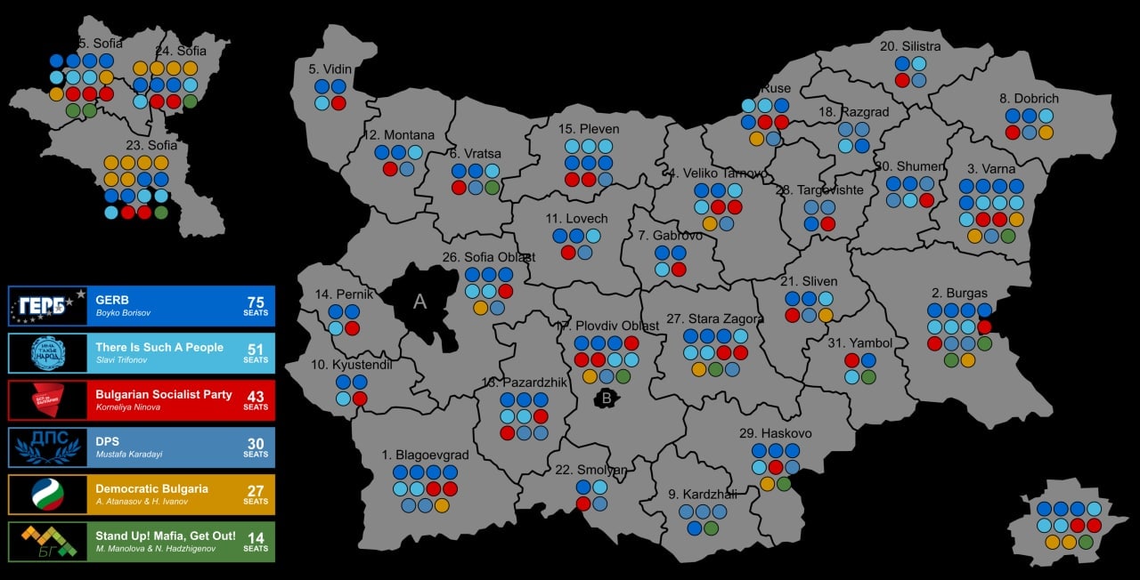 📊 Після розподілу мандатів у ЄТН буде 65 депутатів. Тільки на двох менше - 63 - буде в ГЕРБ. У соціалістів буде 36 місць в парламенті. "Демократична Болгарія" отримає 34 депутатських мандатів. У партії турецької меншини та "Вставай! Мафія геть!" буде 13 депутатів. Таким чином, "нові партії" - ЄТН, "Демократична Болгарія" і "Вставай! Мафія геть!" - сумарно отримують 112 місць в новому парламенті. Однак для формування коаліції потрібні 120 мандатів.