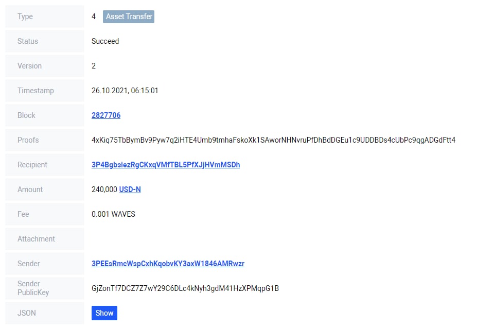 Транзакция на : 240.000 : https://wavesexplorer.com/tx/8MYvJn9RBXLabMJvg6uke64Zd71CVY83aNEf3XB1tSYp