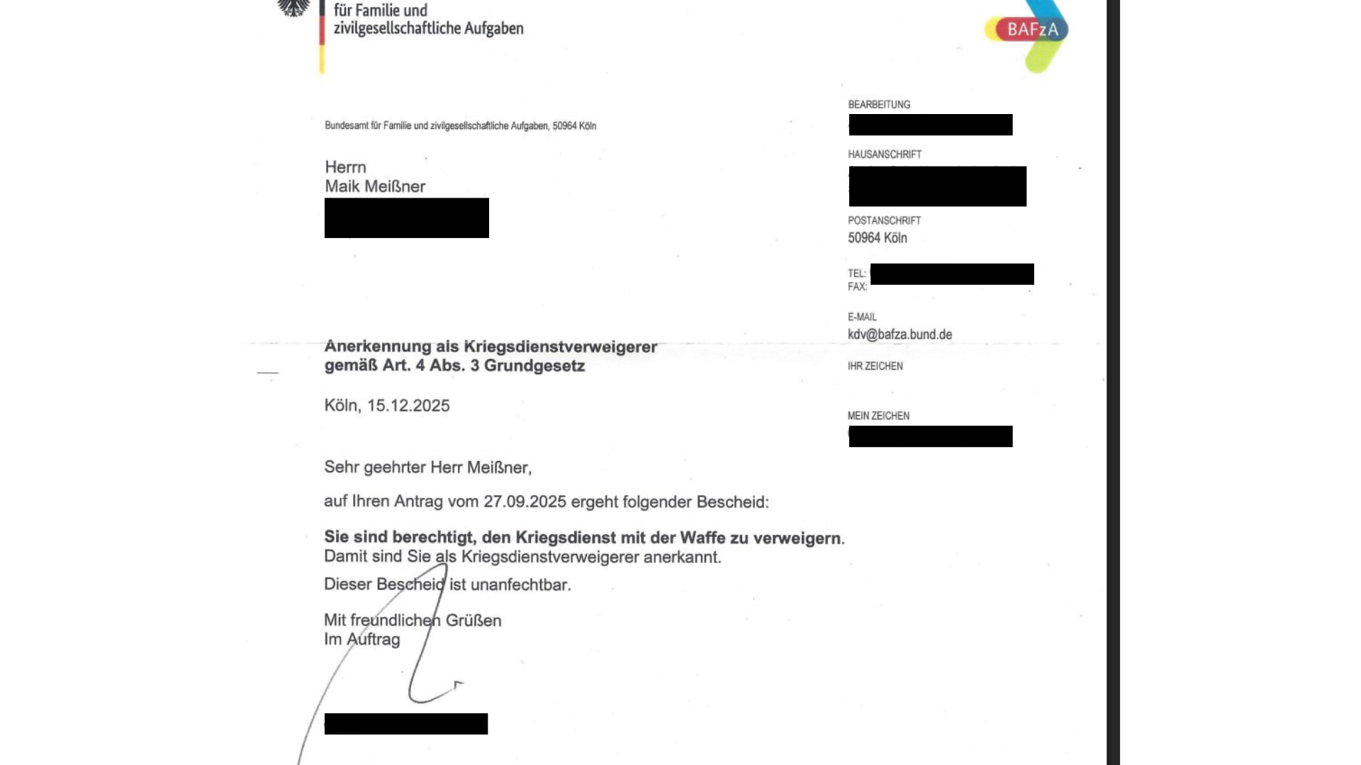 Maik Meißner hat mit Kriegsdienstblocker.de seine Verweigerung eingereicht und innerhalb von 2-3 Monaten seine Bestätigung erhalten.