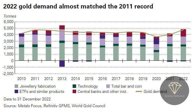 В результате закупок центральных банков общий мировой спрос на золото в прошлом году достиг 4 741 тонны, что на 18% больше, чем в 2021 году, и является самым высоким показателем за весь год с 2011 года.