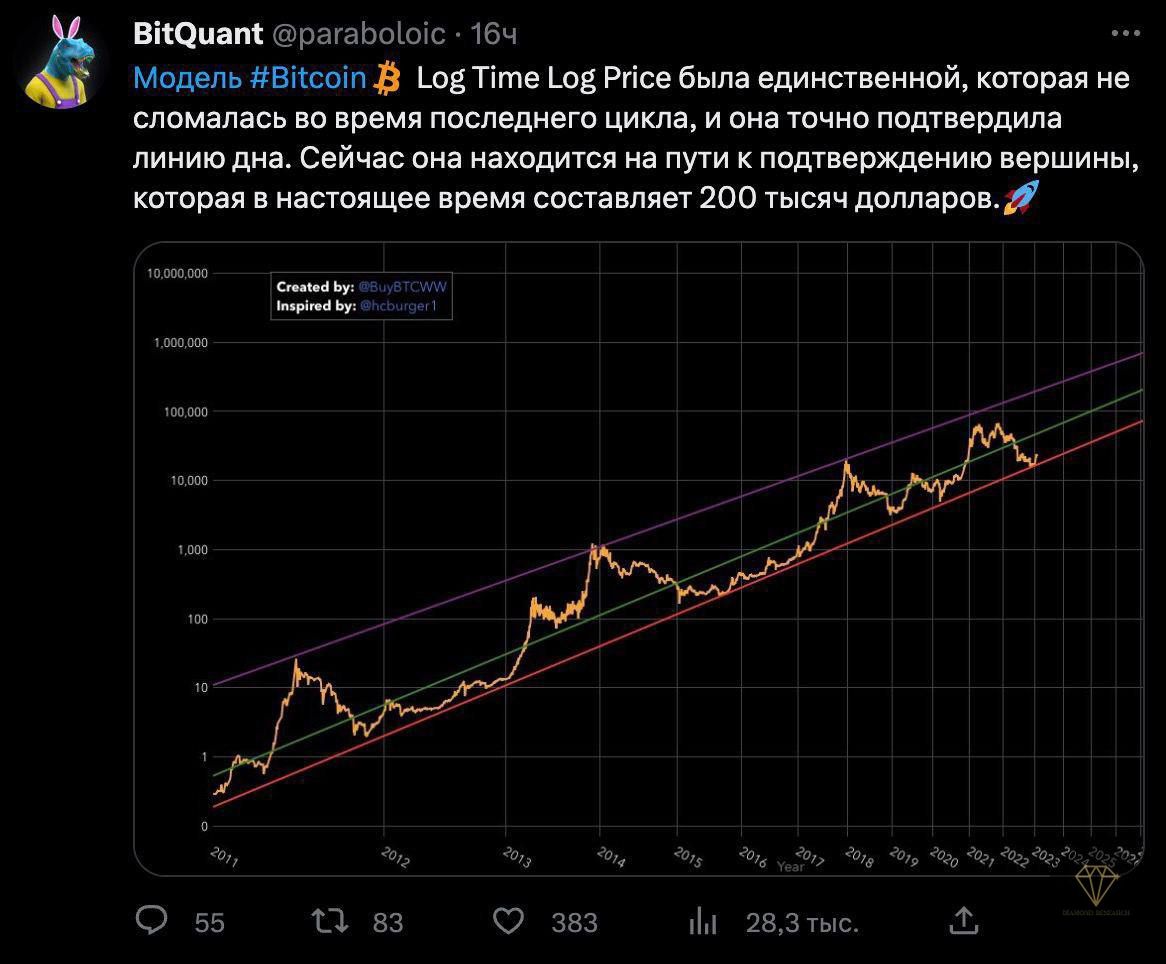 Модель Log Time Log Price была единственной, которая не сломалась во время последнего цикла, и она точно подтвердила линию дна. Сейчас она находится на пути к подтверждению вершины - 200 тысяч долларов🚀