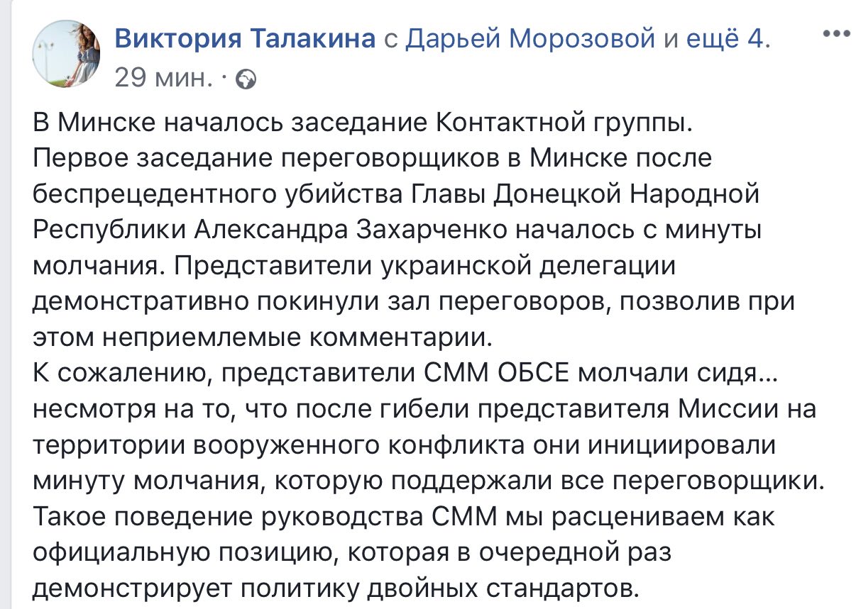 Сегодняшнее заседание минской контактной группы началось с минуты молчания. Украинская делегация, правда, выскочила из зала - пригорает. А представители СММ ОБСЕ решили не вставать вовсе.