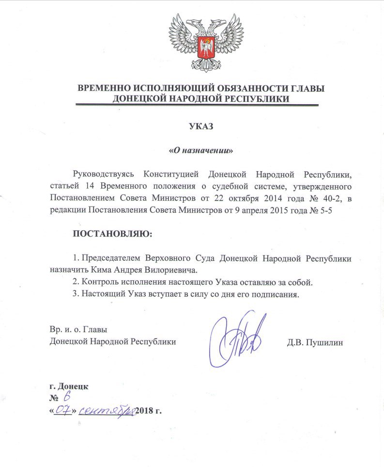 ⚡️Указом Вр. и .о. Главы ДНР Дениса Пушилина от должности отстранен Председатель Верховного Суда ДНР Эдуард Якубовский и назначен Андрей Ким