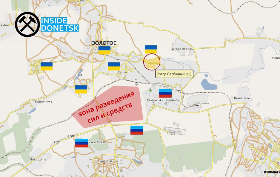 💥Захваченную часть поселка Золотое-4 (х. Свободный, укр. - Вольный) окружает несколько естественных и искусственных возвышенностей. Отвал горных пород, или террикон, поселок Золотое-5 контролируемый ЛНР и хутор Родина – ☝🏼выше захваченной части поселка.