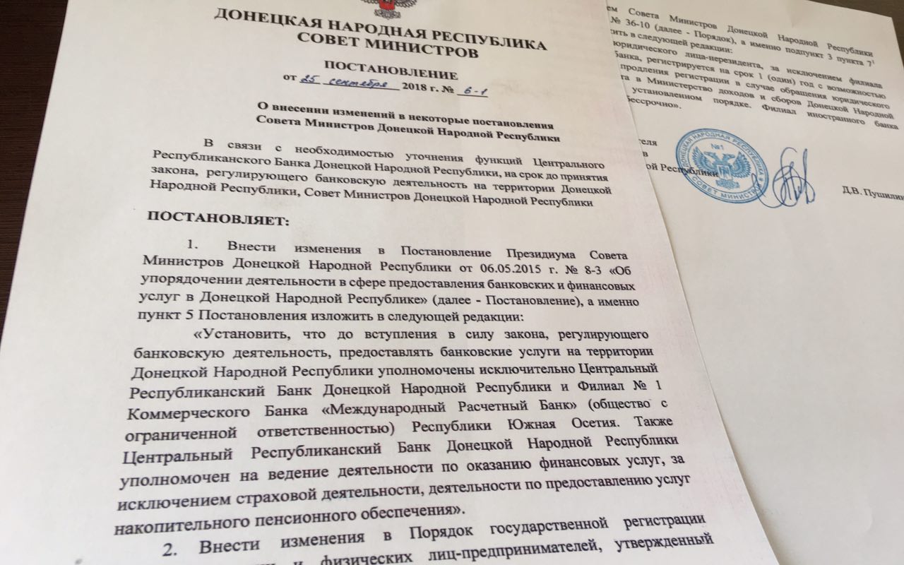 Вот, к примеру, из вчерашнего постановления совмина ДНР «Об упорядочении деятельности в сфере предоставления банковских и финансовых услуг в Донецкой Народной Республике» следует, что предоставлять банковские услуги, кроме ЦРБ, на территории ДНР может только «Международный Расчетный Банк» Республики ЮО.