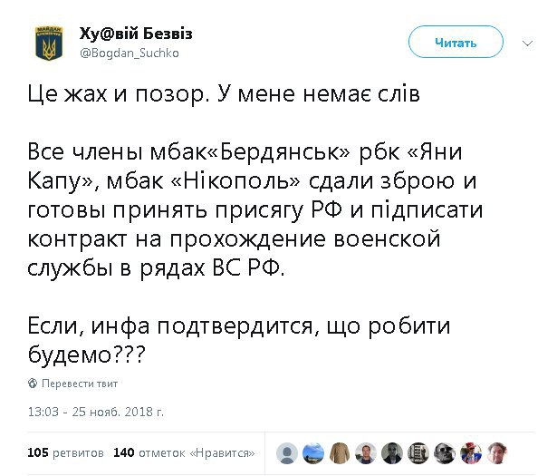 Если инфа подтвердится, то скоро остальные украинские военные на провокации в Керченский пролив поплывут на надувных лодках и самопальных плотах, потому что в России такой хуйни нет. 😂