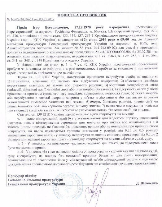 Повестка, которой его приглашают прибыть в здание Генпрокуратуры в Киеве 17 января в 9-00, была опубликована на сайте ГПУ.