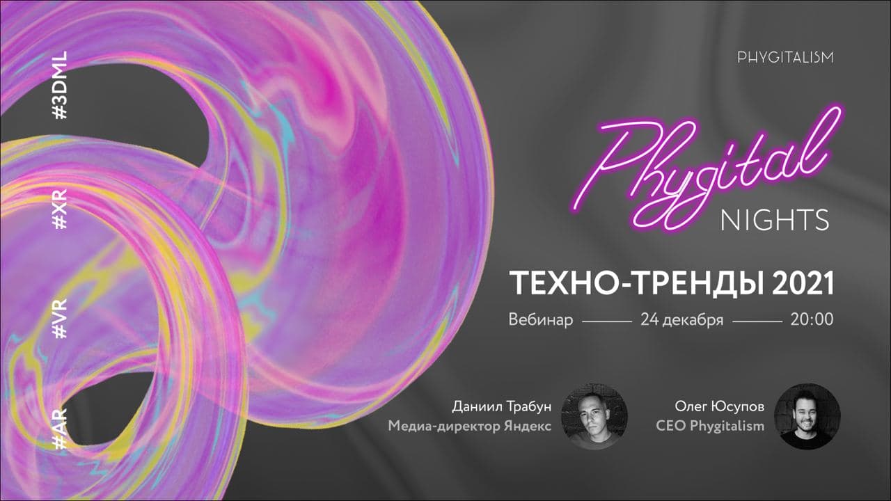 24 декабря в 20:00 пройдет новогодняя образовательной вечеринка PHYGITAL NIGHTS от наших друзей из PHYGITALISM 💜 Даниил Трабун (медиа-директор Яндекс) и Олег Юсупов (CEO PHYGITALISM) в прямом эфире обсудят технологические тренды, которые сильно повлияли на нас в 2020 и особенно проявят себя в следующем году.