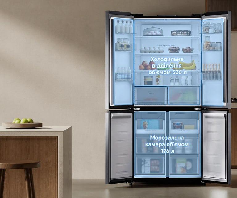 Він оптимальний для повсякденних потреб великої родини і дозволяє зберігати їжу без будь-якого стресу. Девайс легко вмістить все необхідне: запасайся улюбленими продуктами, розміщуючи їх в холодильній камері об'ємом 326 л або в морозильній камері об'ємом 176 л. Нова зона зі зручними висувними контейнерами продовжить свіжість улюблених овочів і фруктів.
