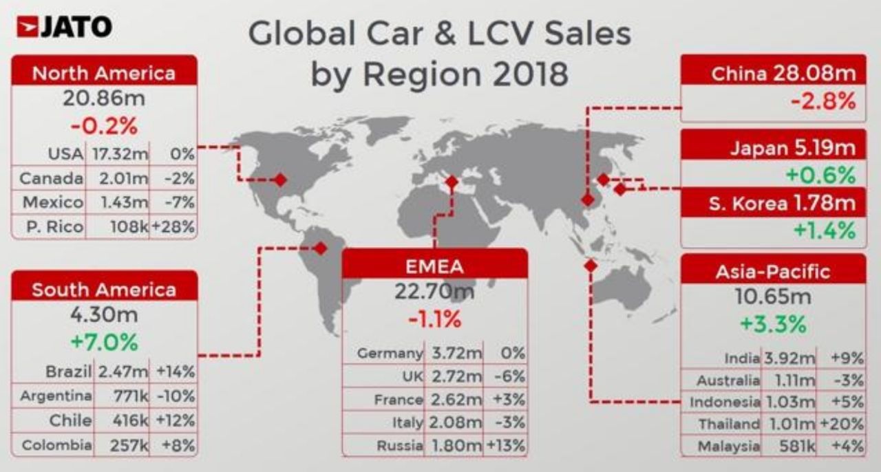 Аналогичные цифры продаж автомобилей в 2018 году (не включая легкие коммерческие автомобили), показывают ту же картину. Объем азиатского рынка можно оценить по количеству автомобилей, проданных в прошлом году: