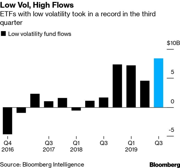 На графике, фонды ETF с низкой волатильностью поставили рекорд по притоку средств в 3 квартале. Результаты предыдущих трех кварталов тоже были впечатляющие.