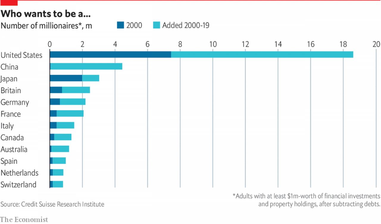 Но в других местах их число растет. По данным «Исследовательского института Credit Suisse» в мире насчитывается 46,8 млн. долларовых миллионеров, что на 1,1 млн больше, чем в середине 2018 года. Их ряды включают более 4 миллионов китайцев, 3 миллиона японцев и 2 миллиона немцев. Тем не менее, ни одна страна не имеет более глубоких карманов, чем Америка, которая насчитывает почти на 19 миллионов миллионеров (см. диаграмму). На США приходится более половины роста количества толстосуммов в этом году. Несмотря на колебания рынка, торговые войны на нескольких фронтах и опасения рецессии, в стране за 12 месяцев к середине 2019 года появилось 675,000 новых миллионеров.