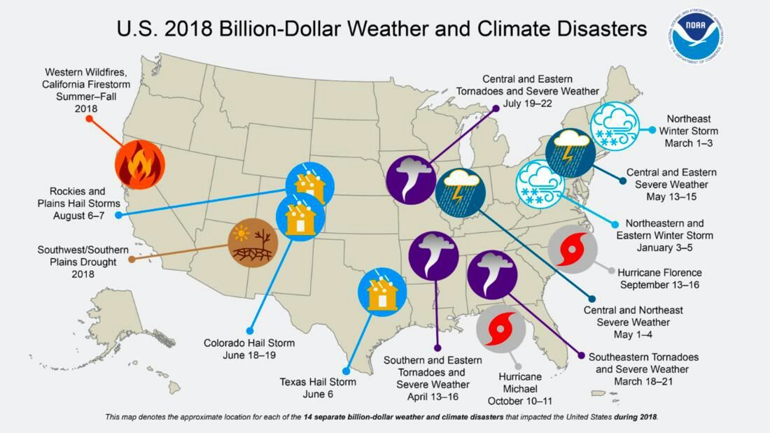 В целом, по оценкам NOAA, эти события обошлись в $91 млрд, из которых $73 млрд потерь было в трех крупных событиях: ураганы «Майкл» $25 млрд и «Флоренция» $24 млрд, а также западные пожары, включая пожары в Карре и Кэмпе в Калифорнии $24 млрд.