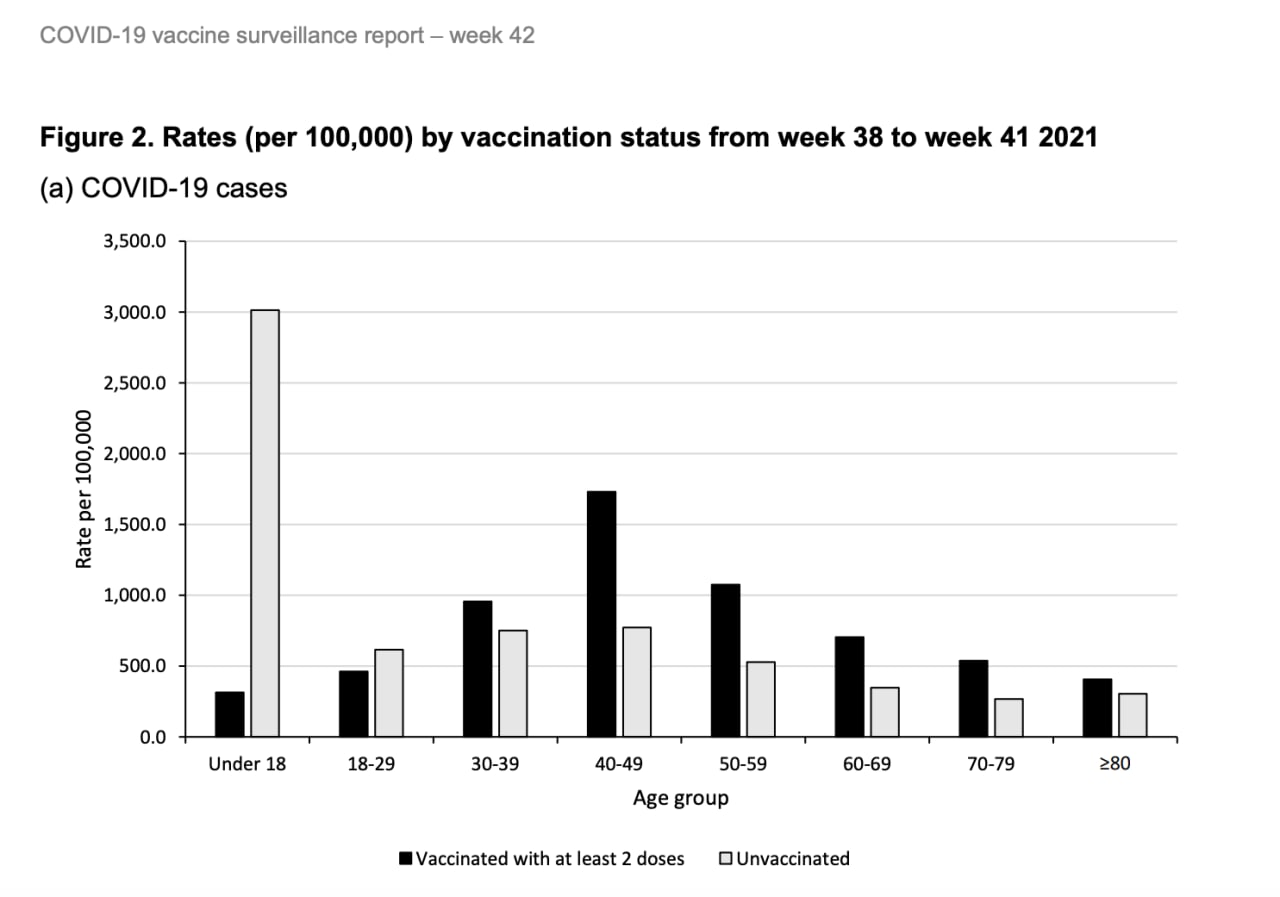 The 40-49 age group showed the worst numbers at double the infection rate among the fully vaccinated, followed by the 50-59, 60-69, and 30-39 age groups. People over the age of 70 who get vaccinated are also at a much higher risk of infection compared to unvaccinated people in that demographic.