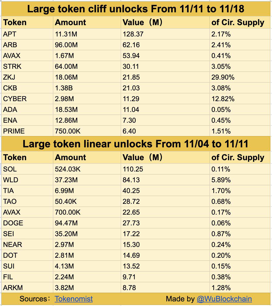 Linear unlocks for SOL, WLD, TIA, TAO, AVAX, DOGE, SEI, NEAR, DOT, SUI, FIL, and ARKM will continue as well.