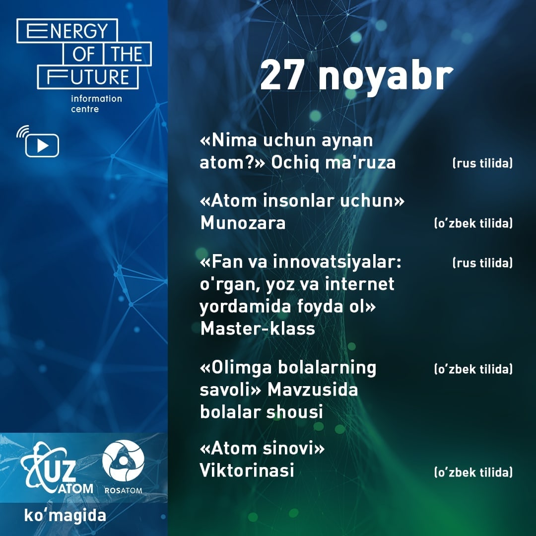 Siz bilan o'zining ilm-fan, innovatsiyalar va yadro texnologiyalari sohasidagi olimlar va ilm-fanni ommalashtiruvchilar o`z bilimlari bilan o'rtoqlashadilar. Va faqatgina ular emas.