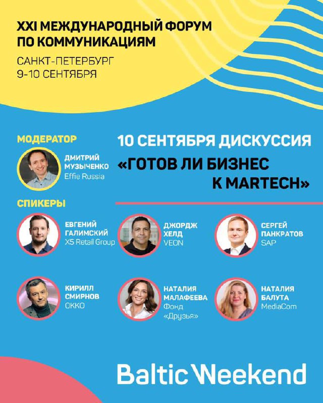 16:00: проведём круглый стол по martech, где соберем лидеров из разных отраслей бизнеса и обсудим перспективу технологических решений в маркетинге.