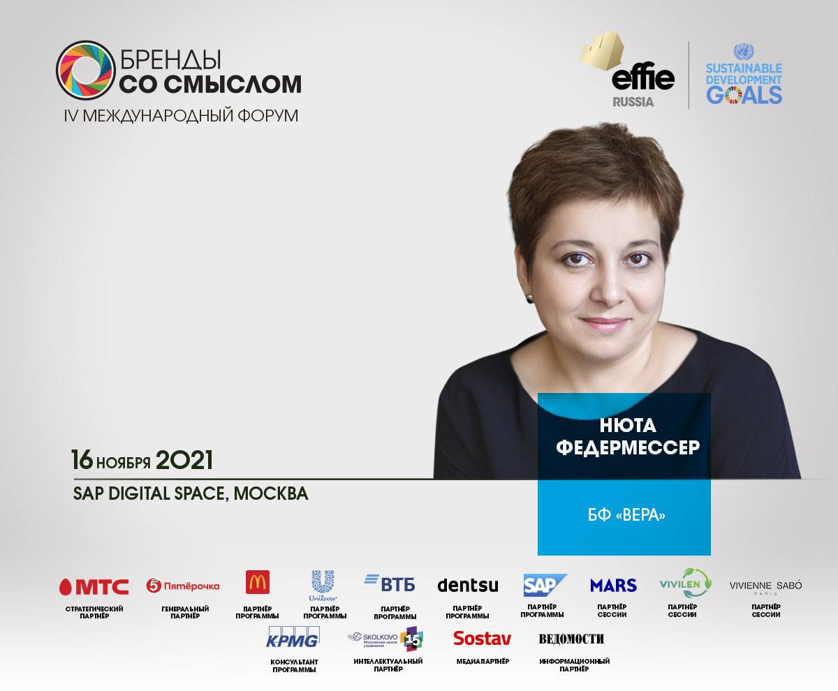 Нюта Федермессер основала благотворительный фонд помощи хосписам «Вера», чтобы поддерживать самых уязвимых людей - тех, кого уже нельзя вылечить. На форуме «Бренды со смыслом» Нюта расскажет свою историю, которая вдохновляет на действие других и меняет мир в тех точках, где это кажется невозможным.