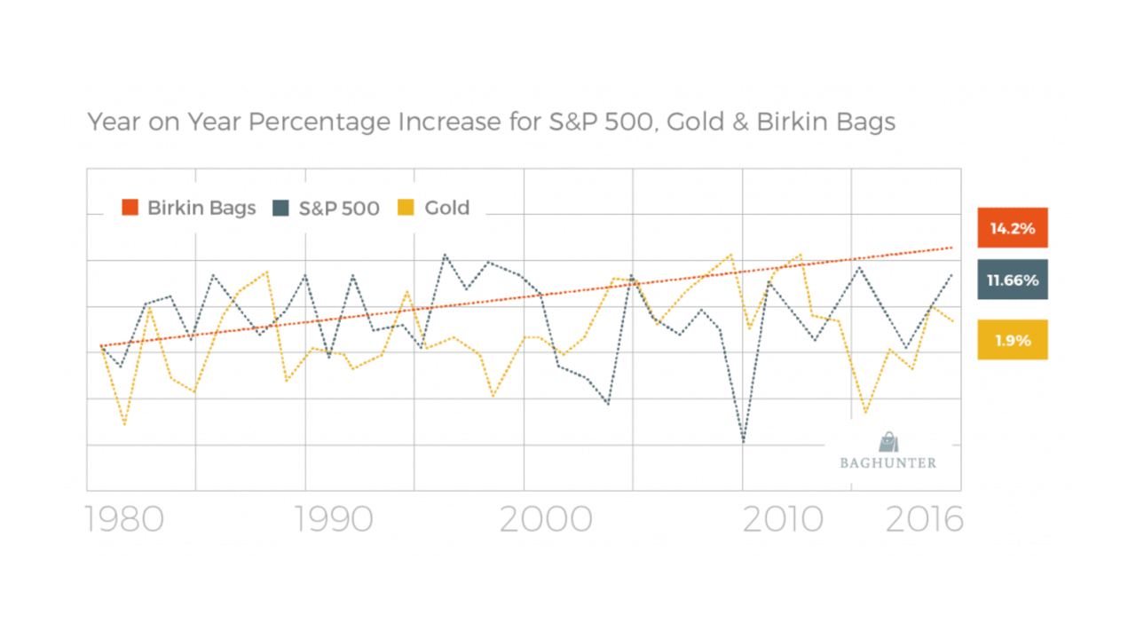 «Считается, что все началось с 2016 года. Тогда Baghunter опубликовали отчет, в котором проанализировали доходность сумок Hermès Birkin. Оказалось, что если сравнить их с фондовым рынком и золотом, то сумки выглядят более привлекательной инвестицией. Пока рынки акций и золота то поднимались, то падали — Birkin стабильно росли в среднем на 14% в год.