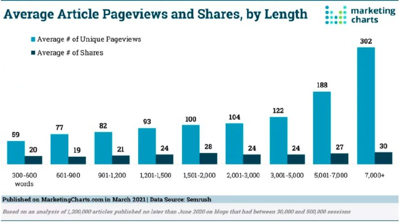 • Контент, содержащий более 7000 слов, получил в среднем 302 уникальных просмотра, что в шесть раз больше, чем сообщения из 300-600 слов (59 уникальных просмотров).