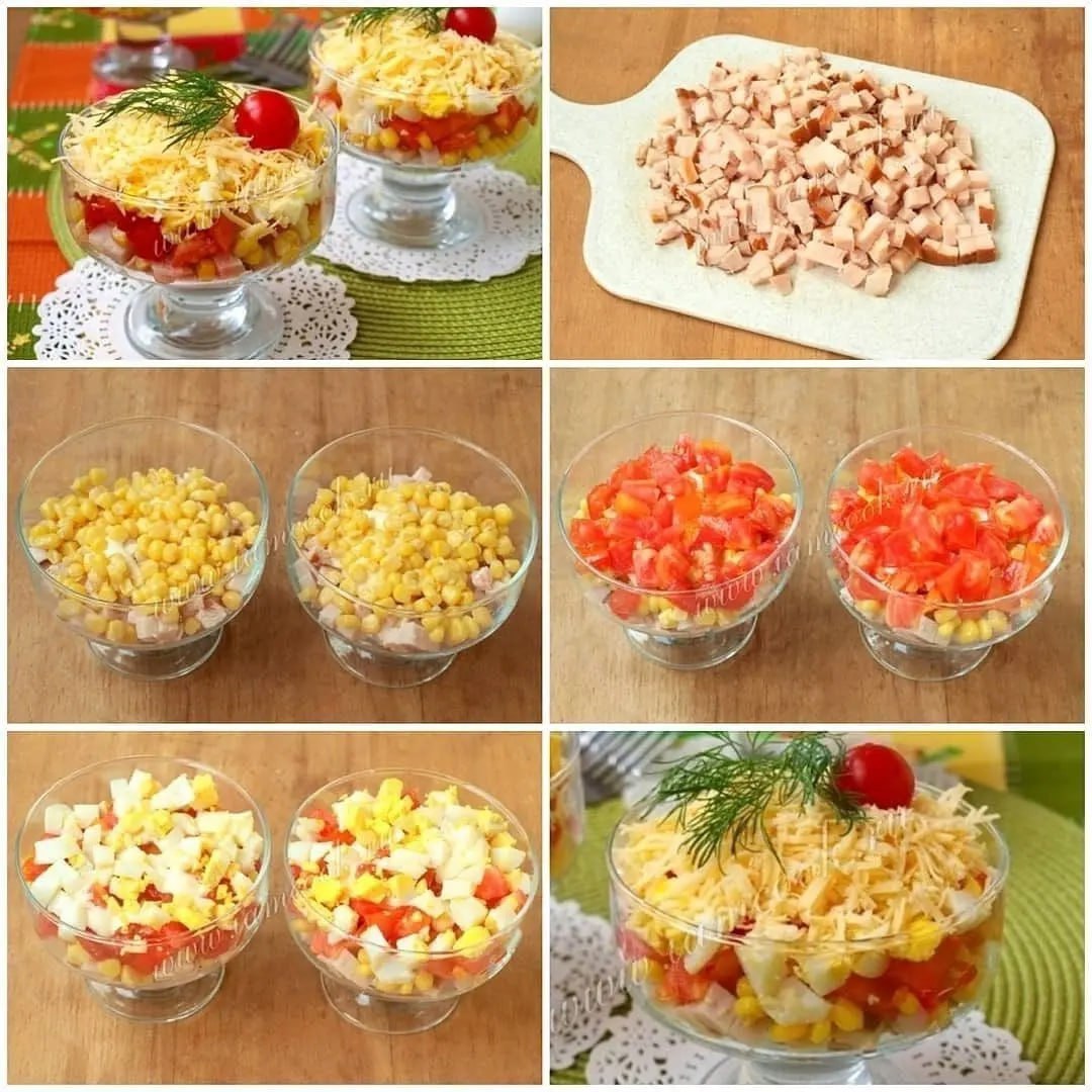 На кукурузу нанести тонко майонезную сетку и выложить помидоры.