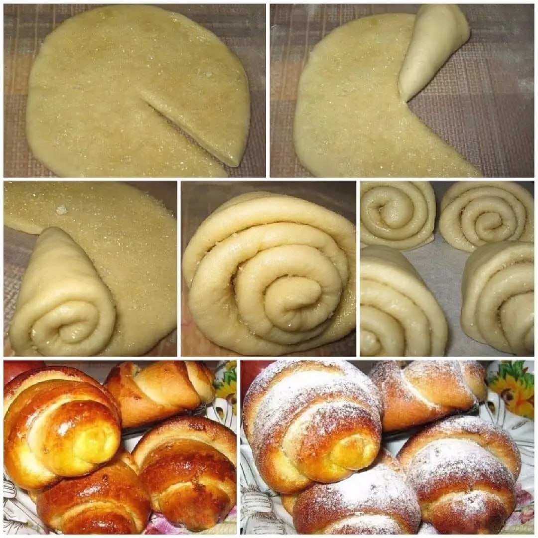 Готовое тесто разделить на шарики, величиной, как маленькое яйцо и раскатать их в тонкие лепешки. Каждую из них смазать растительным маслом, посыпать сахаром и сделать надсечку острым ножом от средины до края. С одной стороны лепешки поднять край и скатать по кругу в рулет-конус. Выложить плюшки на противень с бумагой для выпечки, дать расстояться минут 15-20 (можно смазать желтком) и поместить в духовку, разогретую до 190 градусов. Выпекать около 30 минут до готовности. При выпечке плюшки подымутся и разойдутся – получатся красивые завитушки. При подаче посыпать сахарной пудрой.