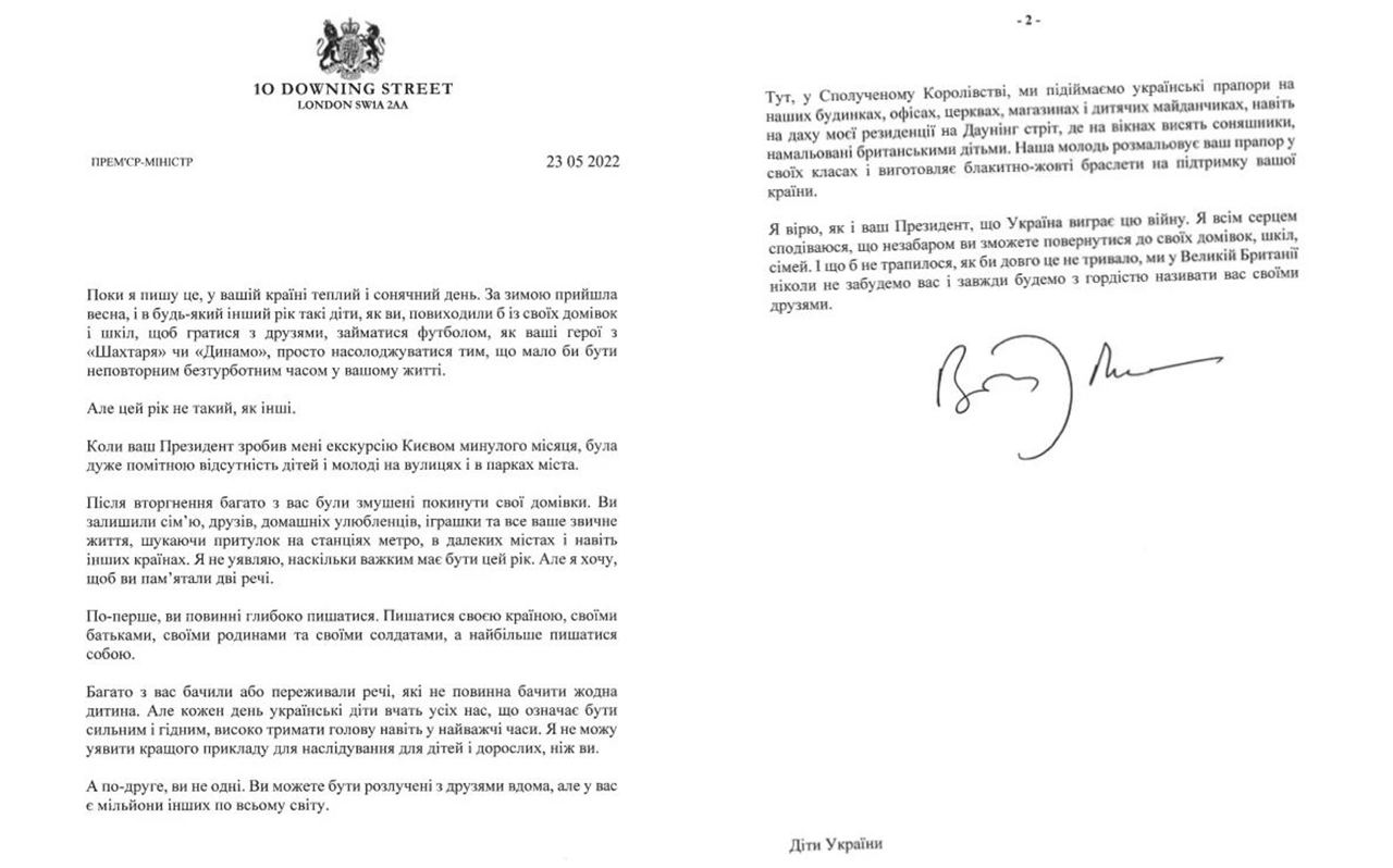 «Я вірю, як і ваш президент, що Україна виграє цю війну. Я всім серцем сподіваюся, що незабаром ви зможете повернутися до своїх домівок, шкіл, сімей. І що б не трапилося, як би довго це не зайняло, ми у Великобританії ніколи не забудемо вас і завжди будемо з гордістю називати вас нашими друзями», — так закінчує лист Борис Джонсон.