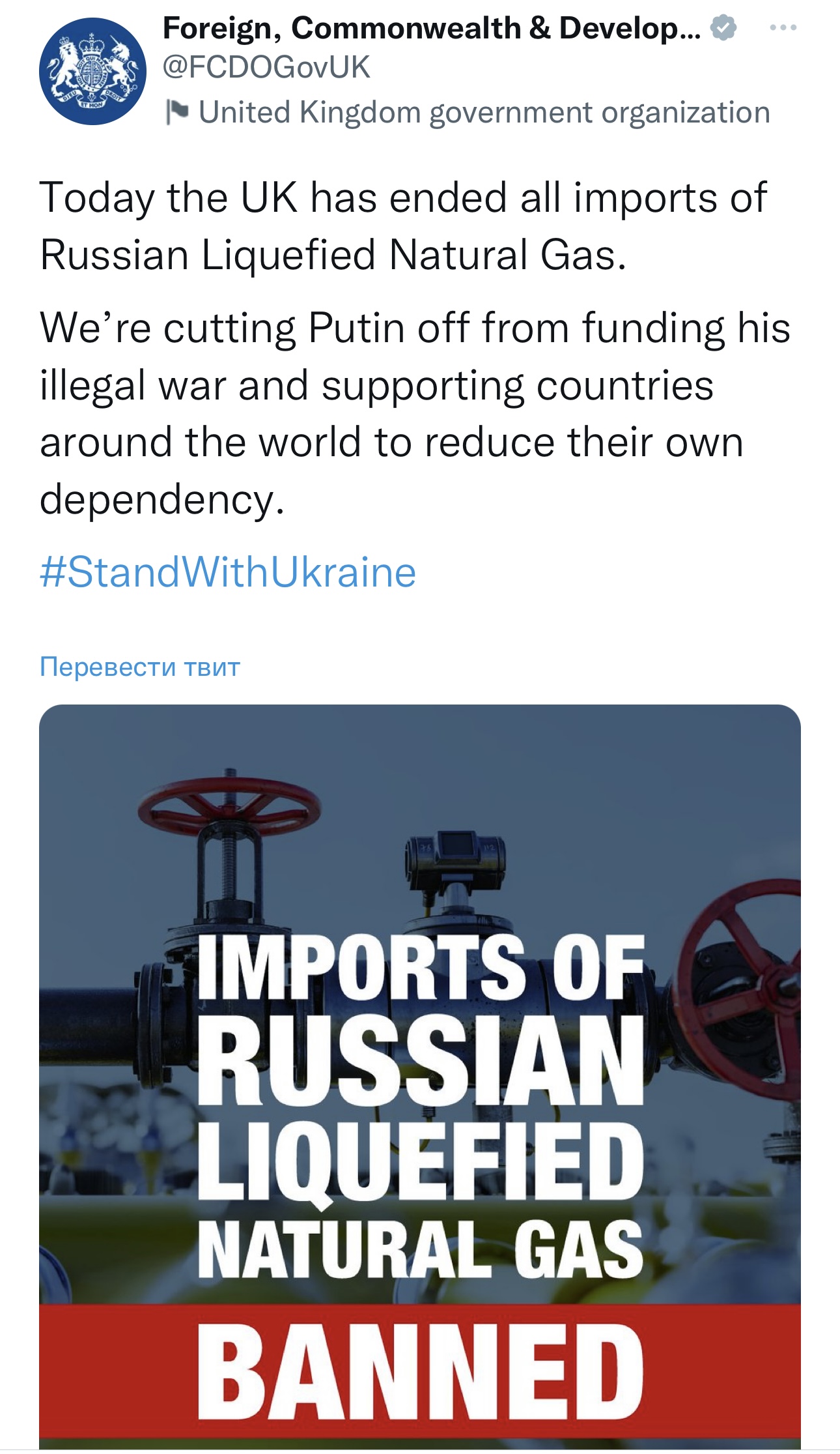 С 1 января Великобритания полностью отказалась от поставок сжиженного природного газа из РФ (Twitter-аккаунт МИД Британии).