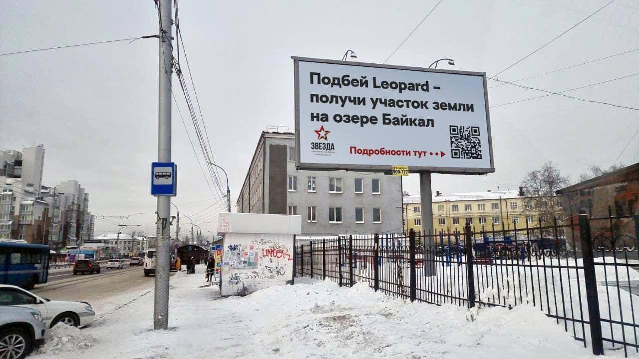 В Иркутске на улице Байкальской появился банер, на котором иркутянам обещают участок на Байкале за подбитый танк Leopard.