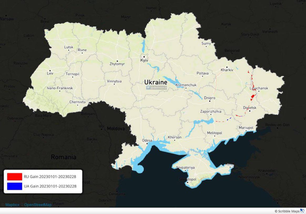 Вот и весна пришла. На карте показано (красным) продвижение на фронте второй армии мира за время зимнего наступления в этом году.
