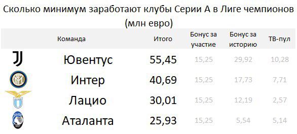 Интересно, что «Аталанта» из всех четырех итальянских участников ЛЧ базово получит меньше всех – все из-за низкого 10-летнего исторического рейтинга. Далеко впереди «Ювентус», который даже продув все матчи, получит от УЕФА денег на аж четырёх Миранчуков.