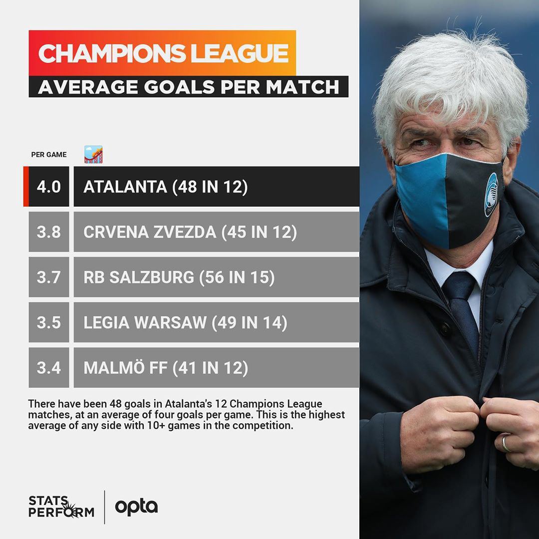 Пока у бергамасков 12 матчей в турнире, и в играх с участием нерадзурри было зафиксировано 48 голов (23 забито и 25 пропущено). То есть в среднем 4 гола за матч. И это самое большое отношения голов к игре для всех клубов в истории турнире среди клубов, сыгравших большее 10 игр в основном розыгрыше ЛЧ (с сезона 1992/93, когда турнир получил текущие название). Довольно условное достижение, но за 28 лет даже на старте чемпионской карьеры ни одна команда не показала такого. Близка «Црвена Звезда», но у сербов на три гола меньше в тех же 12 матчах.