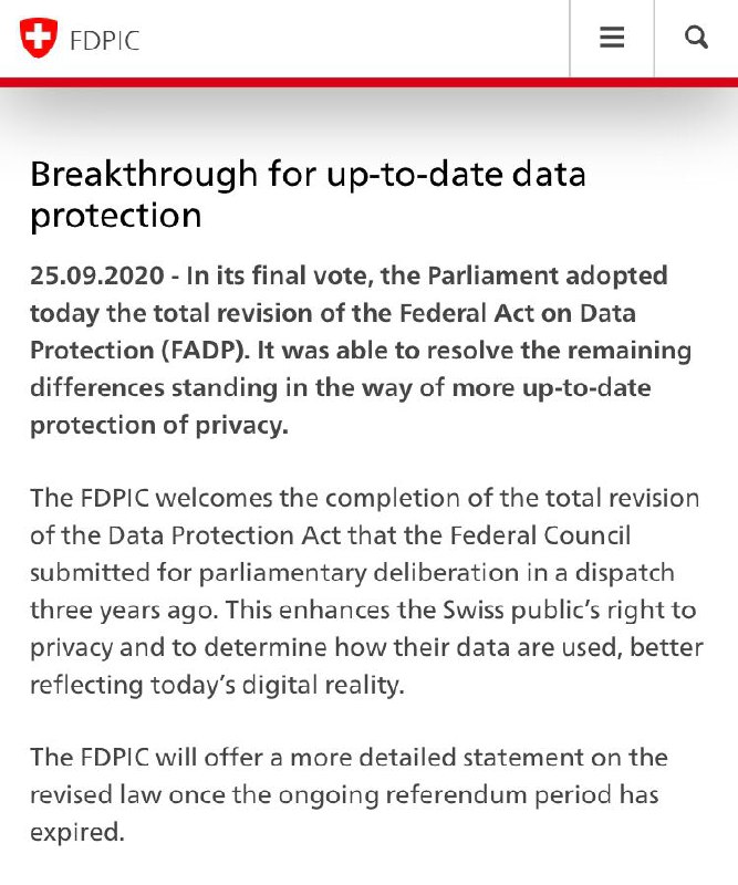 Также Швейцария ждет обновлённое решение от Европейской комиссии в части признания ее страной, обеспечивающей адекватный уровень защиты данных.