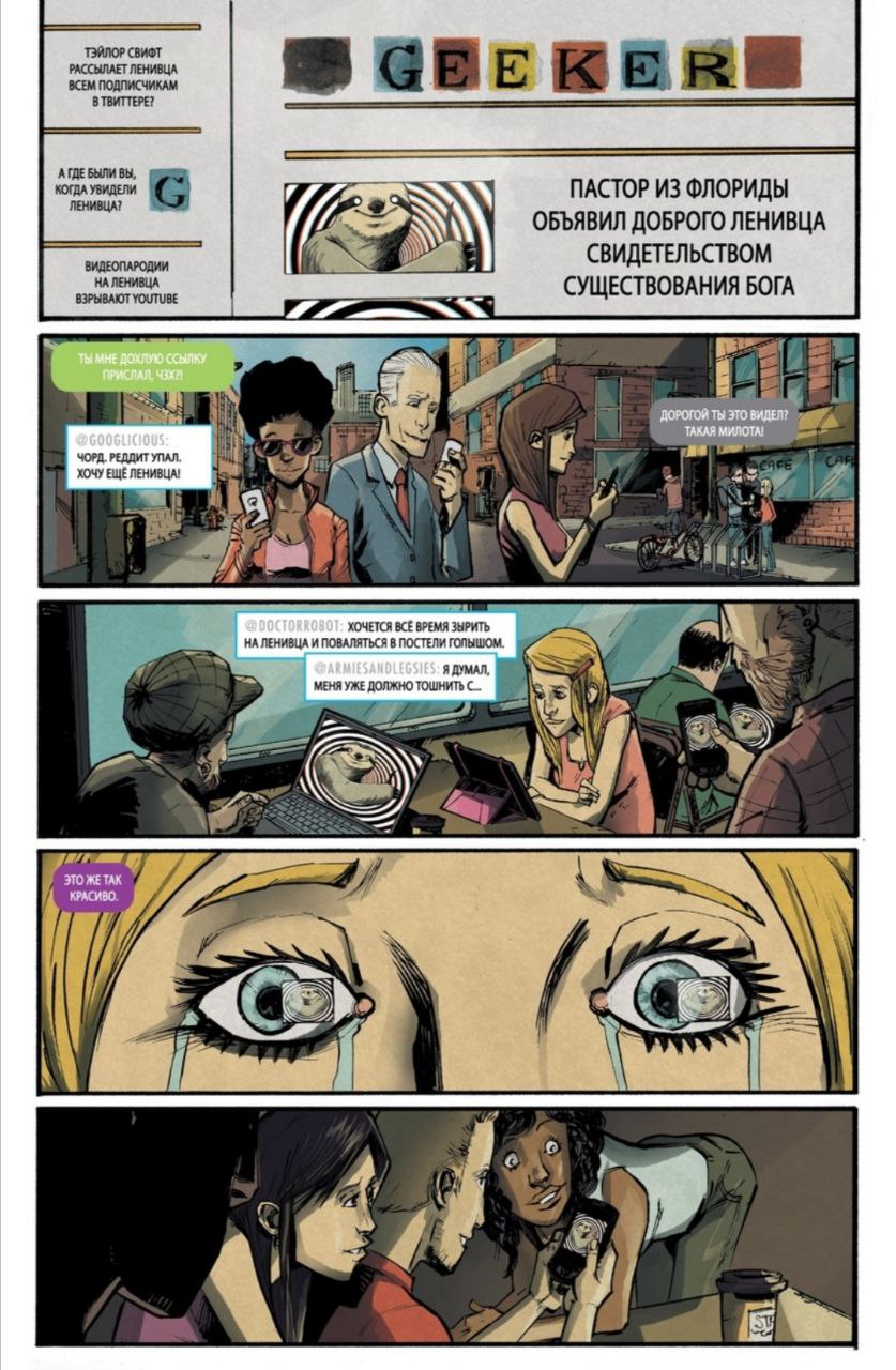 Цветной комикс в трёх главах. Сюжетная завязка интересная: однажды в интернете вирусится картиночка с милым ленивцем на фоне гипнотических кругов. Каждый, кто видит картинку, испытывает мощный прилив благодати и счастья, картинку репостят, посылают друзьям, показывают по телеку в утренних новостях… Только наш главный герой-дальтоник ничего не чувствует, глядя на ленивца. Что оказывается к лучшему – через несколько часов после знакомства с картинкой у людей начинаются неконтролируемые приступы агрессии, желание ознакомить с новым мемом всех вокруг и убить тех, кто его не хочет видеть. В пересказе звучит как smart ass комментарий к культуре репостов картиночек, но читается как хороший постапокал – картинку видели все, цивилизация рушится под волной насилия. Чтобы найти автора, человека, выпустившего мем в сеть, американские спецслужбы собирают команду из последних не видевших картинку агентов под командованием слепого ветерана. Это довольно круто. И сама идея, и ощущение безнадежности, и угроза измениться безвозвратно от того, что просто увидишь что-то (что-то, что демонстрируется новыми фанатиками на каждом экране и каждой стене). В общем, ознакомиться интересно, но сильно многого от комикса не ждите – мне показалось, что авторы чего-то недожали (или меня просто не торкнула линия оторванного от мира ГГ), а уж финал… Жестокая шутка авторов, это финал.
