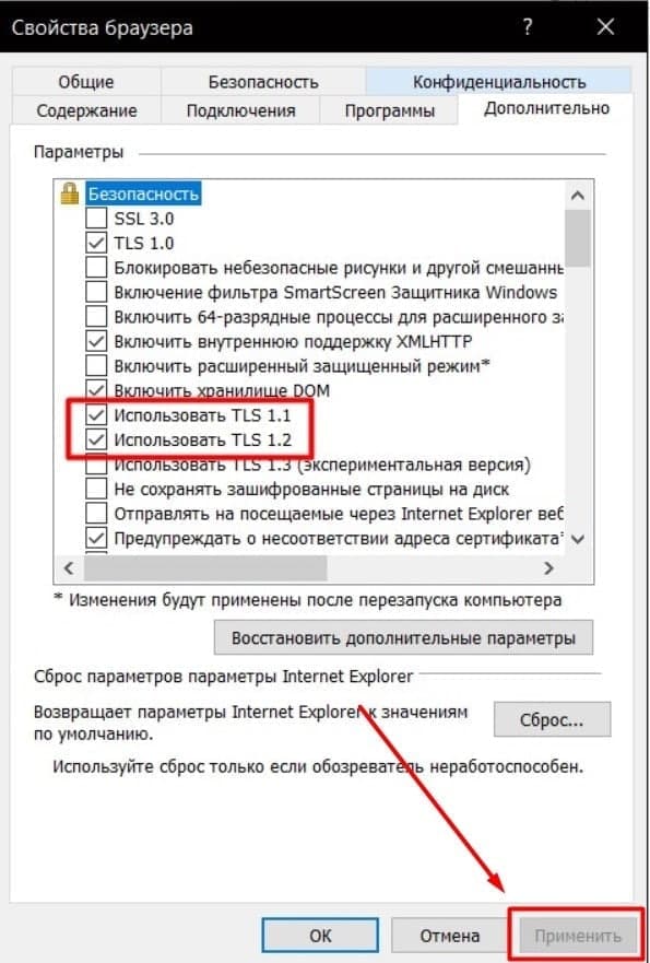 3️⃣ Включите TLS 1.1 и TLS 1.2, как показано на скриншоте.
