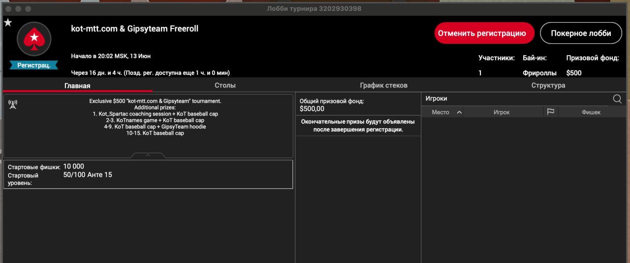 ❗️Турнир называется kot-mtt.com & GipsyTeam Freeroll, холдем, 9-макс