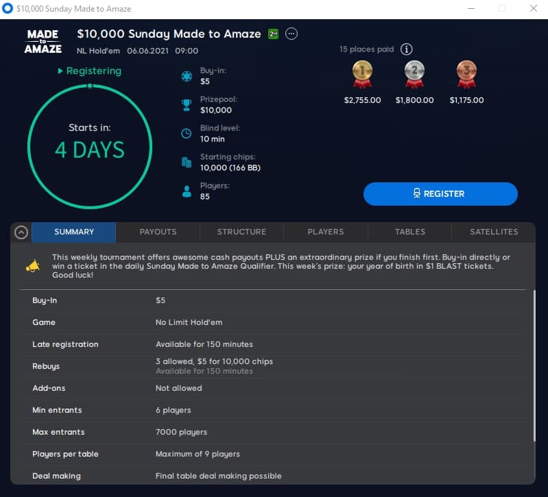 Каждое воскресенье в 21:00 по Москве на 888poker идет турнир Sunday Made to Amaze за $5 с гарантией $10,000! Помимо денежного приза, победитель получит один из необычных подарков. В это воскресенье это будет годовой запас бай-инов в спины по $1! Если точнее, билетов дадут по году вашего рождения — то есть около 2,000. В другие недели будут другие призы: