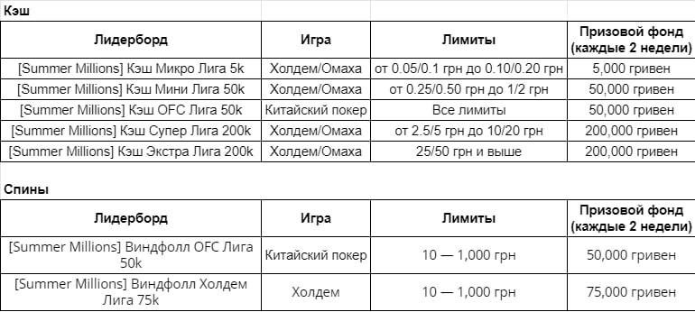 📋 Всего 5 кэш-лиг (холдем/омаха от 0.05/0.1 гривны и китайский покер) и 2 лиги спинов (холдем и китайский покер от 10 гривен).