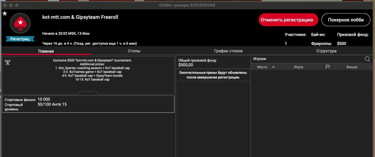 ❗️Турнир называется kot-mtt.com & GipsyTeam Freeroll. Пароль опубликуем на этом канале за час до старта турнира.