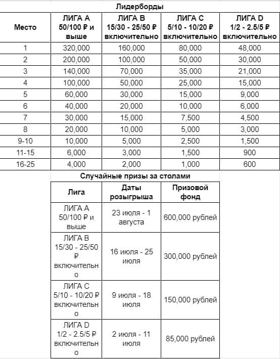 💥🎁 У каждой Лиги будет 10 дней, когда денежные бонусы будут выпадать случайным образом. К примеру, для лиги А ежедневно с 23 июля по 1 августа ежедневно будет распределяться по 60,000 рублей. Если играть два стола, то можно получить два приза!