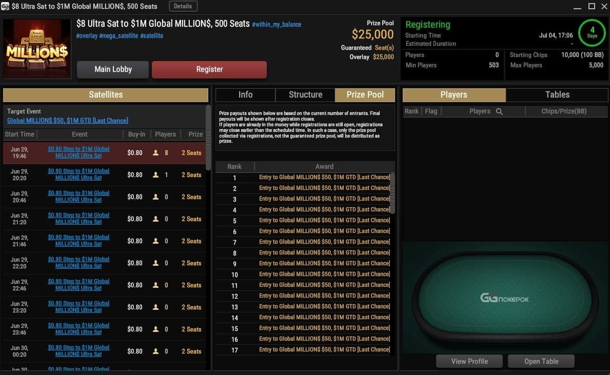 4 июля на GGпокерок снова пройдет Global MILLION$ — самый крупный турнир за $50 в интернете. Всю неделю несколько раз в сутки идут отборочные дни, финал — в воскресенье в 22:30. На прошлой неделе в турнире был приличный оверлей — входов набрали меньше 19,000 (при гарантии на 20,000 — и это не считая рейка). Победил бразилец с ником Adxxy, он получил $88k. Россиян в этот раз на финалке не было.