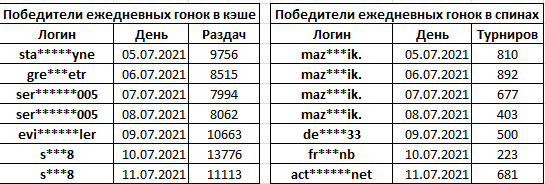 Самым активным кэшевиком оказался s___8, который взял на себя выходные: за субботу и воскресенье он сыграл почти 25 тысяч раздач. А его коллега ser______005 играл в среду и четверг — хватило 16 тысяч. Ну а в мире спинов царствовал maz___ik: он победил 4 дня подряд с понедельника по четверг, причем в последний день оказалось достаточно 403 спинов. Впрочем, в субботу другому нашему победителю, fr___nb, для победы и вовсе хватило всего 223 турнира. Интересно, что остальные реги спинов делали в субботу? 🧐