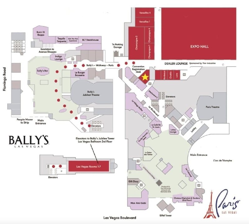 Где же теперь будет проходить Мировая серия? Если все подтвердится, новым домом для WSOP станут два казино, которые стоят рядом и соединены длинным коридором: Bally’s и Paris (смотрите схему ниже). Оба принадлежат Caesars Entertainment, владельцам бренда WSOP. Там гораздо больше места: в RIO было около 13,000 квадратных метров, а объединенные казино могут расположить покерные столы на огромной территории в 29,000 метров 🇺🇸
