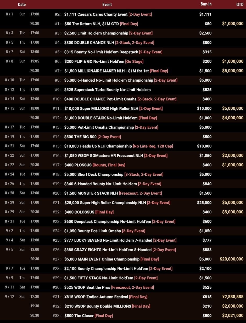 🏆 Main Event, $5,000. Гарантия $20 млн, флайты начнутся 22 августа, финалка 5 сентября. Каждый игрок может сделать максимум 3 входа. В прошлом году такой же турнир установил рекорд по призовому фонду в истории онлайна, собрав $27.5 млн призовых. Выиграл его тогда болгарин Стоян Маданжиев ($3.9 млн), обыграв в хедз-апе китаянку Венлинг Гао ($2.7 млн).