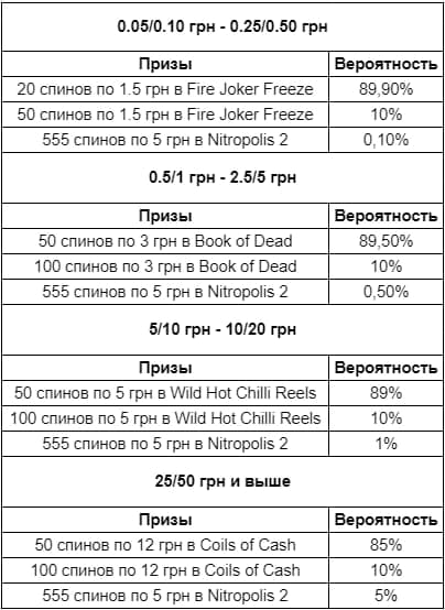 Козырная карта дает фриспины размером от 30 до 2,775 гривен. Чем выше лимит, тем больше шансов получить более крупный приз! Полученную карту нужно активировать в течение 48 часов.