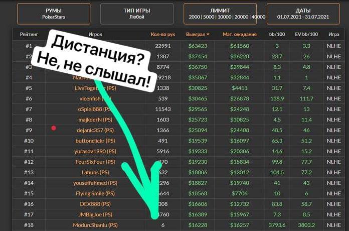 😳 Лудуманн. К концу июля Рахулу экшена уже хватило, зато во вкус вошел тот самый Ludumann — в какой-то момент ему тоже удалось посидеть с семизначным стеком. На кнопки нажимал он размашисто, экшен собирался мгновенно: с ним успели поиграл Трутеллер, Максим Решетов, Сами Келопуро и даже легенда хедз-апов Бен Толлерен, который давно почти не играет в онлайне. Результат столкновения анонимного россиянина с мировой покерной элитой был предсказуем — читайте о драматической развязке во втором обзоре на GipsyTeam.