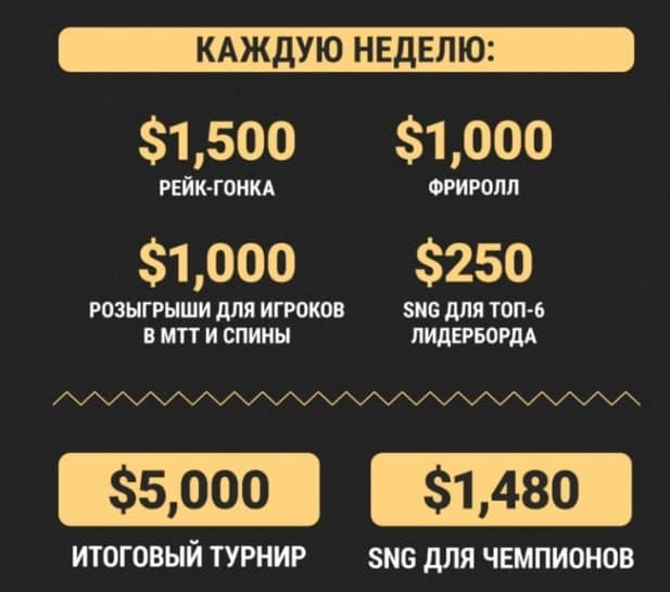 🏆 Основной лидерборд на 500,000 рублей: очки набираются за места в турнирах и зависят от их сложности (х1.5 для бай-инов 2,500 - 15,000 рублей и х2 для главного турнира) и размере стола (4,5,6 или 8 игроков). 100,000 ₽ победителю.