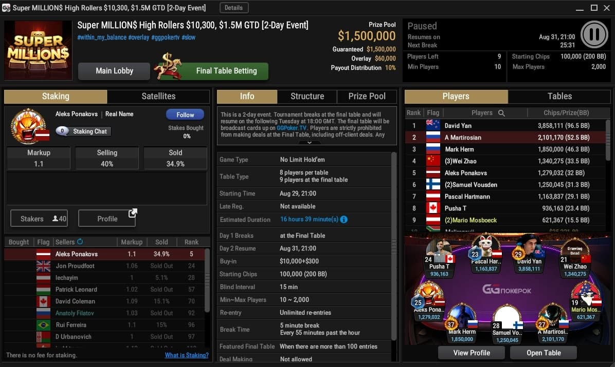 Но и это еще не все. Днем Артур катает офлайн, а вечерами запускает сессии в онлайне. Вчера он вылетел на 10 месте в суперхайроллере на GG за $25,000 (получил $107k), а сегодня вторым стеком начнет финалку Super MILLION$. За первое $326k, покерный букмекер PokerShares считает ставку на Мартиросяна самой выгодной на этой финалке. Поставить на него можно в клиенте GG с коэффициентом 5.9. Трансляцию можно будет посмотреть с 21:00 на ютубе.
