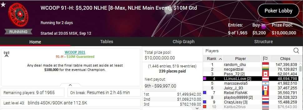 Последний день WCOOP: LlinusLLove тащит главный турнир